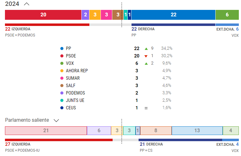 En lo que se refiere a España, confirmando la tendencia al auge de la extrema derecha en nuestro país, estas elecciones las gana el PP con 22 escaños y el PSOE resiste con 20, y los ultraderechistas de VOX se afianzan como tercera fuerza y sube dos escaños en el Europarlamento de 4 a 6, pero la irrupción de otra fuerza ultraderechista fundada por el agitador social Alvise Pérez con tres escaños de su partido Se Acabó La Fiesta (SALF), incrementa la fuerza de los autoritarios en el Parlamento de Europa. En relación al resto de fuerzas podemos destacar que Sumar entra con tres asientos, Podemos se deja dos y Ciudadanos, que llegó a ser la tercera fuerza en 2019, desaparece como ha desaparecido del panorama político español.